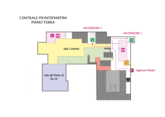 Once you have visited the Sala Colonne and the Sala del treno di Pio IX on the ground floor, it is possible to go up to the Sala Macchine, using lift no.1 (maximum capacity 900 kg).